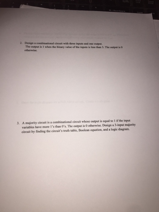 Design a combinational logic circuit with three input variables such that it will produce logic 1 output when one or two the input variables are logic 1 but not all the three.